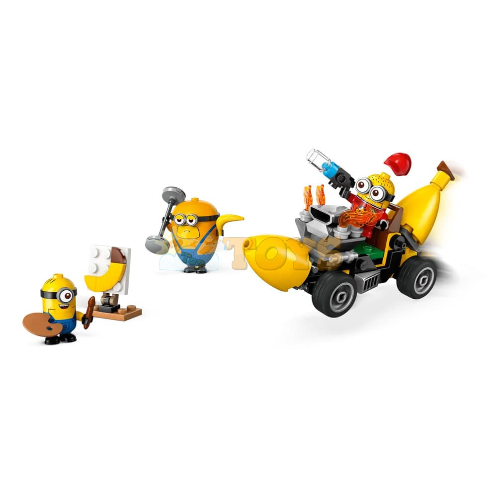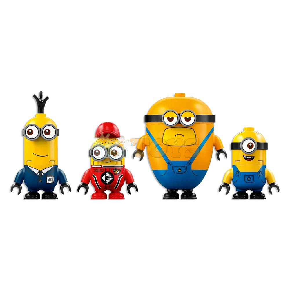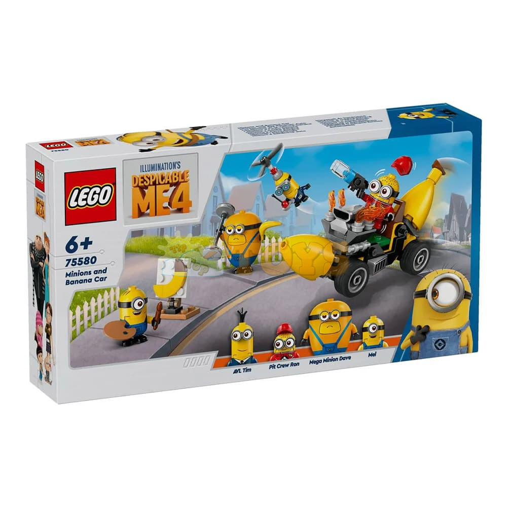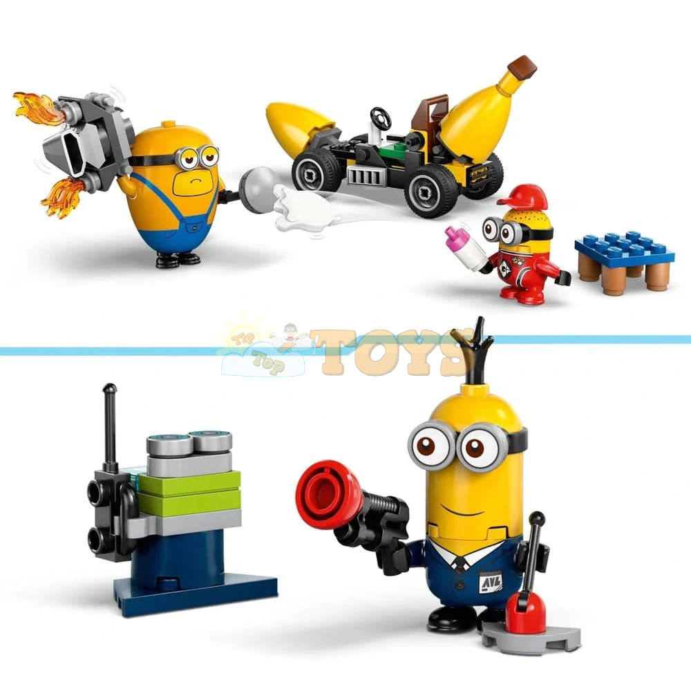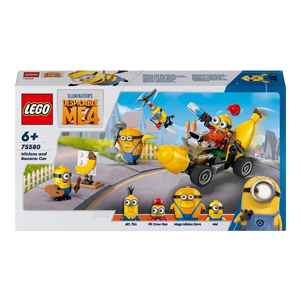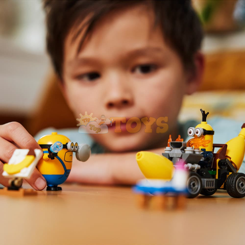 Minyonos LEGO készletet, játék kisautót vagy vidám ajándékot keresel? Akkor nézd meg a minyonok banánautóját, annak vezetőülését és kivehető motorját! A játék járműhöz 4 minyon és kiegészítők is tartoznak. Dave, a mega minyon, egyik kezével fel tudja emelni a motort, míg a másikban egy súlyzót tart. Mel képet fest egy banánról, míg az AVL titkos ügynöke, Tim minyon forgó propellerekkel a fején és távirányítóval a kezében repked. A földön található a bázisa, amely telis-tele van olyan különleges eszközökkel, mint a röntgenszemüveg. Szerelő Ron pelenkaküldetésen van a pelenkázóasztalnál. Minden felszerelése megvan, piszkos-pelus-kipenderítő-puskája is akad. A digitális szórakozásról a LEGO Builder appgondoskodik, amelyben az építők felnagyíthatják és elforgathatják a szetteket.