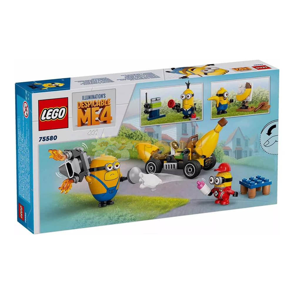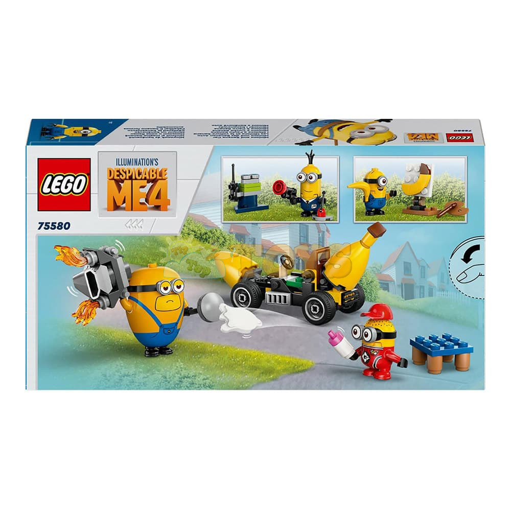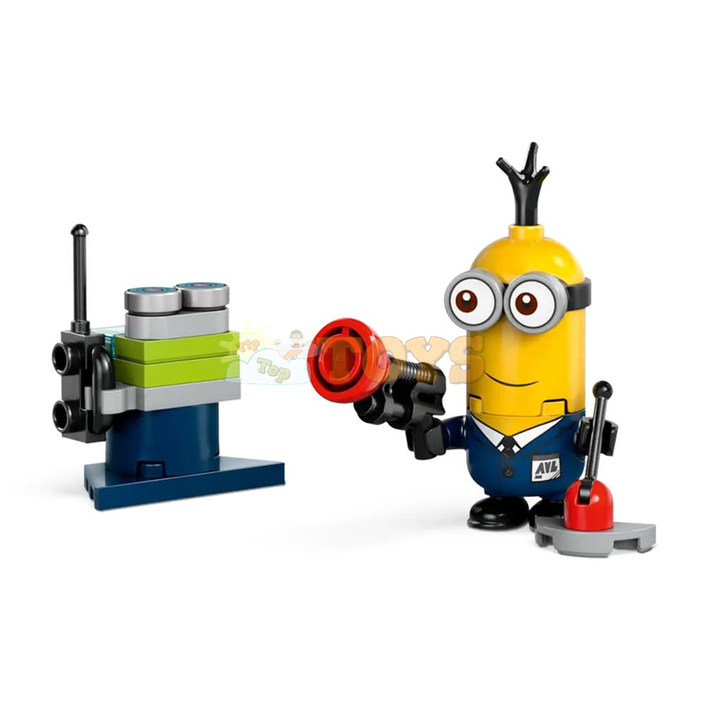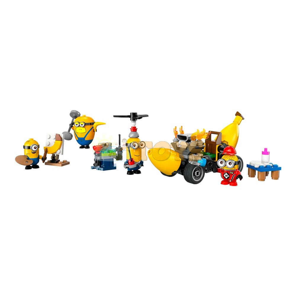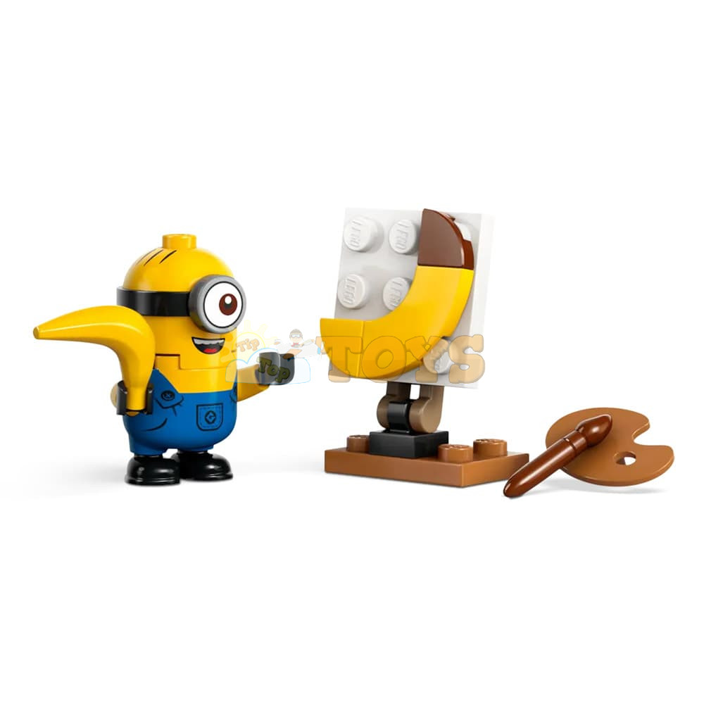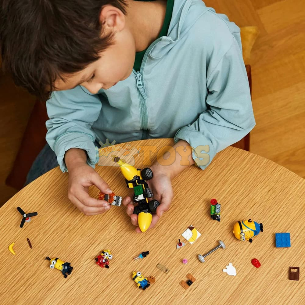 Minyonos LEGO készletet, játék kisautót vagy vidám ajándékot keresel? Akkor nézd meg a minyonok banánautóját, annak vezetőülését és kivehető motorját! A játék járműhöz 4 minyon és kiegészítők is tartoznak. Dave, a mega minyon, egyik kezével fel tudja emelni a motort, míg a másikban egy súlyzót tart. Mel képet fest egy banánról, míg az AVL titkos ügynöke, Tim minyon forgó propellerekkel a fején és távirányítóval a kezében repked. A földön található a bázisa, amely telis-tele van olyan különleges eszközökkel, mint a röntgenszemüveg. Szerelő Ron pelenkaküldetésen van a pelenkázóasztalnál. Minden felszerelése megvan, piszkos-pelus-kipenderítő-puskája is akad. A digitális szórakozásról a LEGO Builder appgondoskodik, amelyben az építők felnagyíthatják és elforgathatják a szetteket.